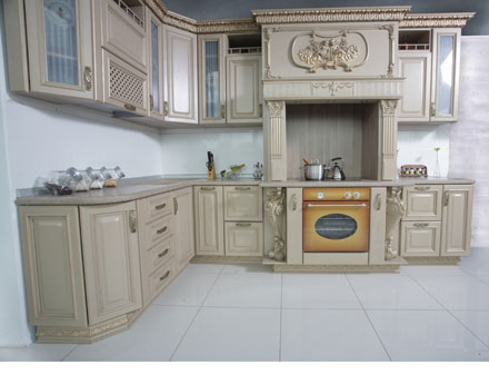 Фасады: массив сосны Столешница: искусственный камень с влитой мойкой Стеновая панель: искусственный камень Пристеночный плинтус: искусственный камень Варочная панель: искусственный камень Истинное воплощение классики. Декоративный портал украшен панно "Ангелы", пилястрой и лепниной. Фасады из массива натуральной сосны "Ангелы", с эффектом золотой патины созданы для самых изысканных покупателей.
